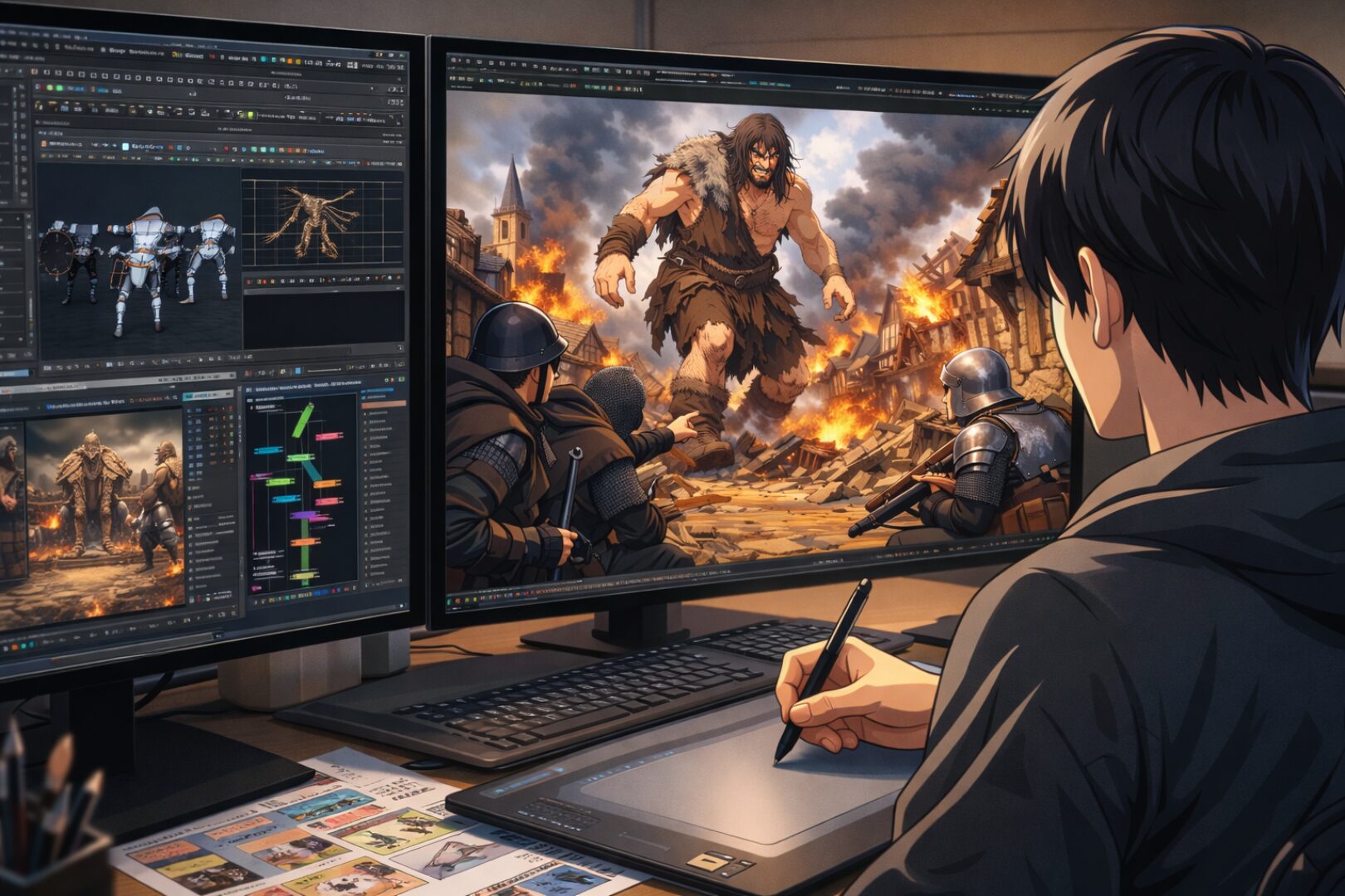 彼は空中で自らを弾丸のように回転させ、巨人の硬い皮膚をバターのように切り裂きます。この動きをアニメ化するためには、膨大な枚数の動画と複雑なパース計算が必要であり、WIT STUDIOの精鋭アニメーターたちの技術がそれを支えていたことは有名です。